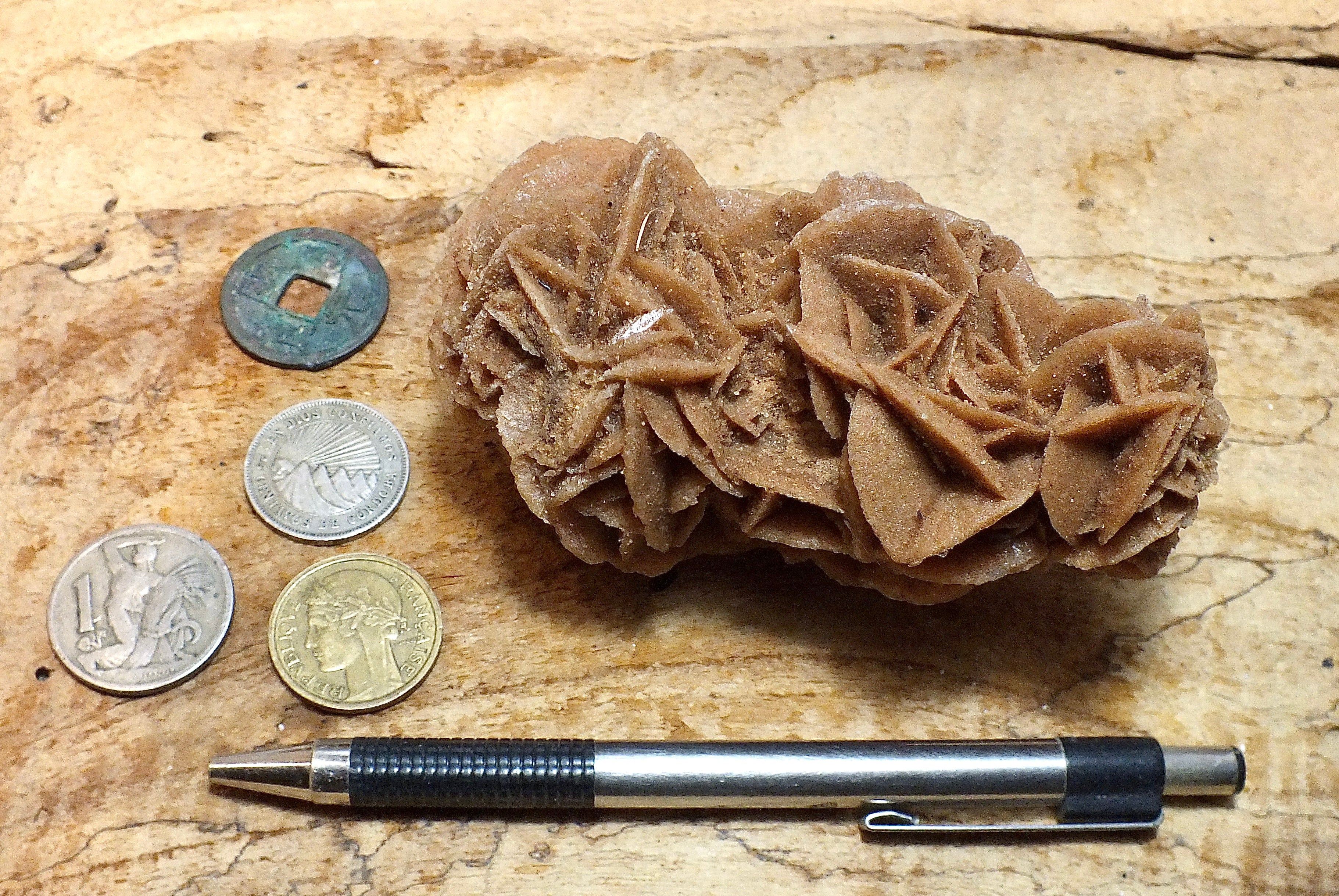 Unlike the white-edged desert roses you see for sale in rock shops, these are unaltered and completely natural. Since gypsum has two attached water molecules, mineral dealers cook selenite roses with a weed burner to drive off the water, turning the edges of the crystals white. They are not found like this naturally, and we prefer that students see this mineral in unaltered form.