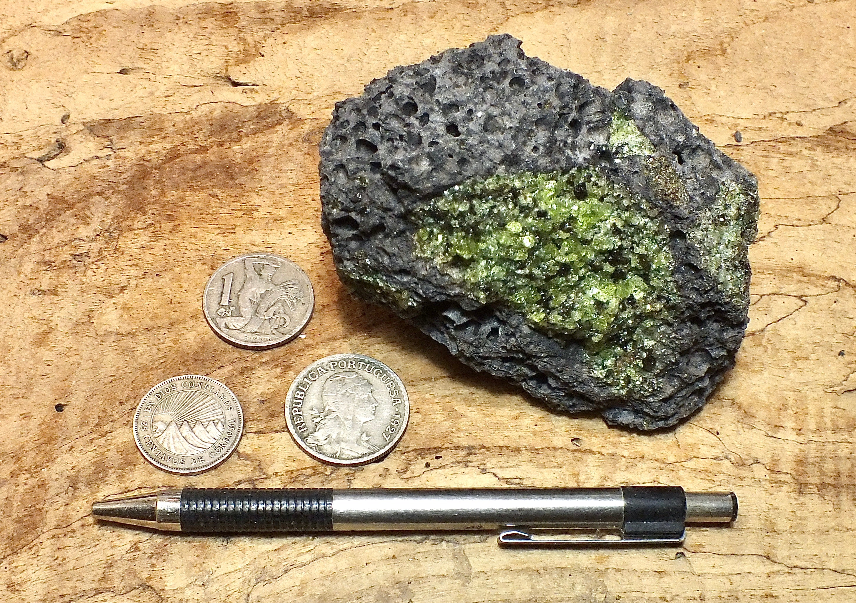 A xenolith is a piece of country rock introduced into a magma during an eruption or emplacement of a batholith. These xenoliths represent fragments torn at depth from a peridotite rock mass through which the phonotephrite magma was forced. Their granular texture resulted from multiple crystallization nuclei. The vesicular phonotephrite that contains these xenoliths erupted in the Middle Pleistocene ~580,000 years ago and caps Peridot Mesa on the San Carlos Apache Reservation east of Globe, Arizona.