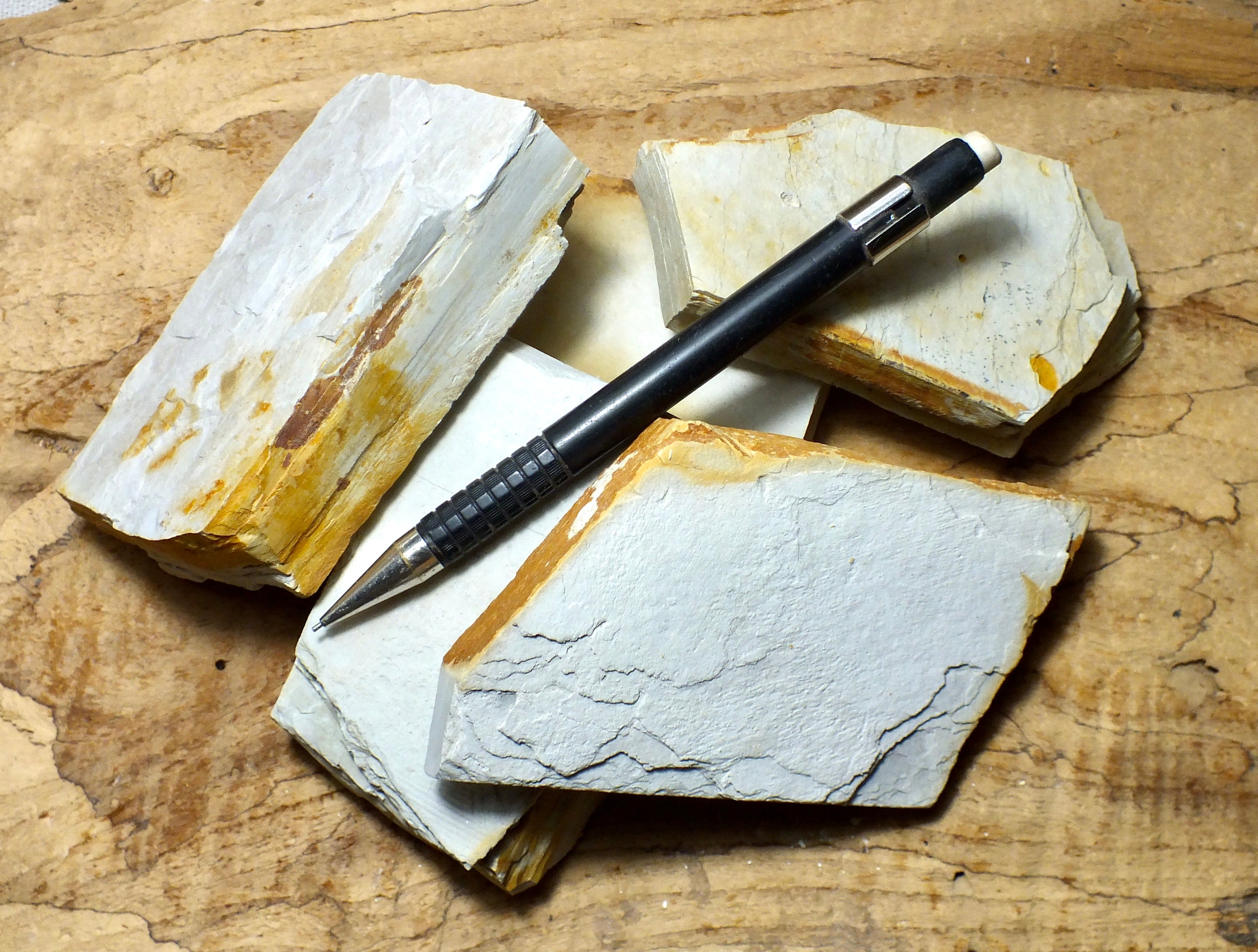 The Altamira Shale, the oldest subunit of the Monterey Shale, is Middle Miocene in age. These specimens are a fairly hard shale, with a fairly high silica content from included volcanic ash, so they will not crumble during student examination as will more fissile shales. Fissile refers to the behavior of shales that weather out as a pile of loose flat flakes. The Monterey shale contains a considerable amount of petroleum and is now drawing considerable new interest. This unit, the Altamira Shale, underlies a large area of the Palos Verdes Peninsula in Los Angeles County. The orange iron staining is typical in outcrops of this shale. On a cut or broken surface, it's light gray to white.