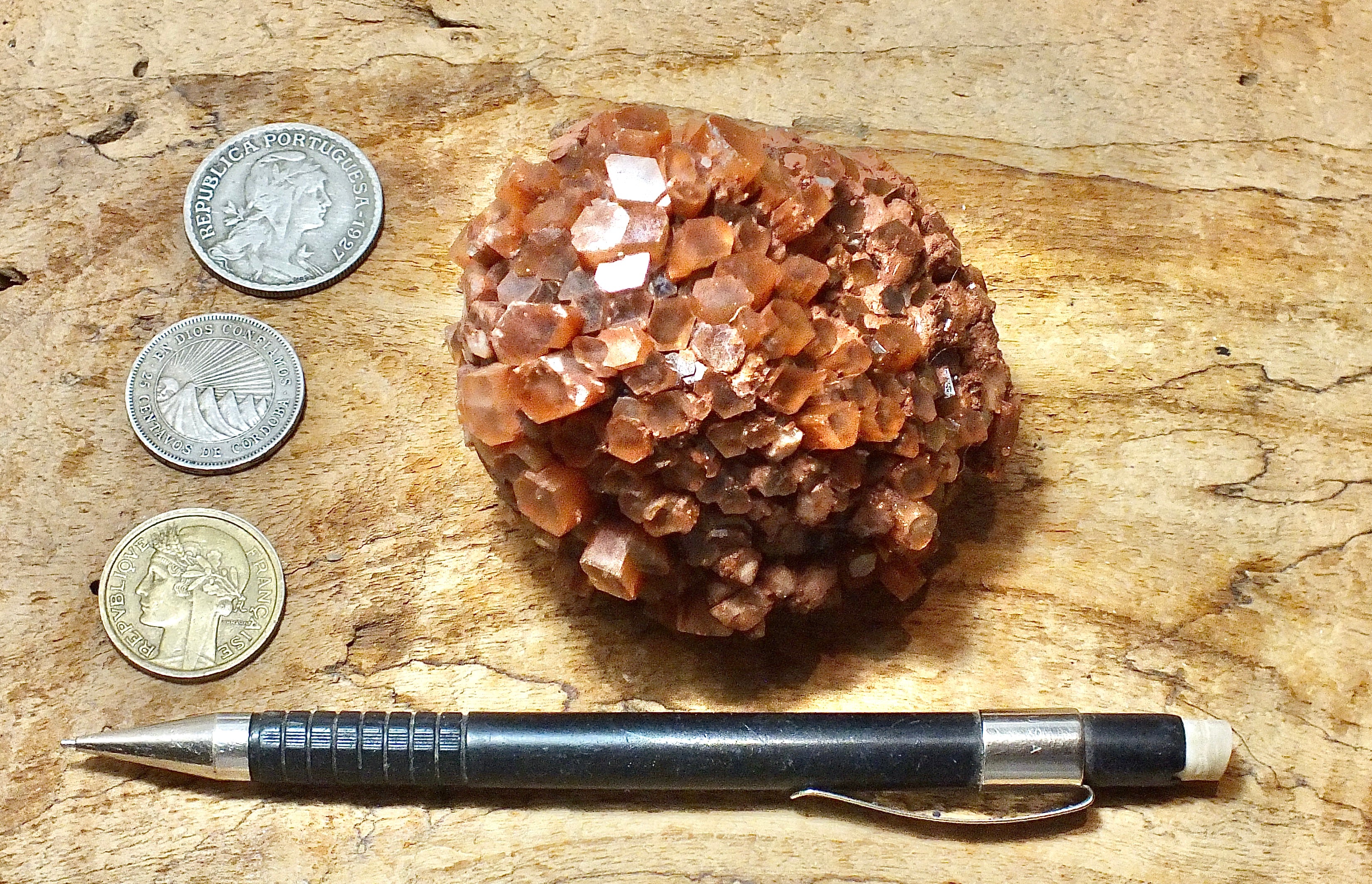 The aragonite clusters at this mine are found in a layer of reddish clay and come out as mudballs. Since the area of the mine is dry, the mudballs are taken to a local river and washed. The reddish color is a hematite stain.