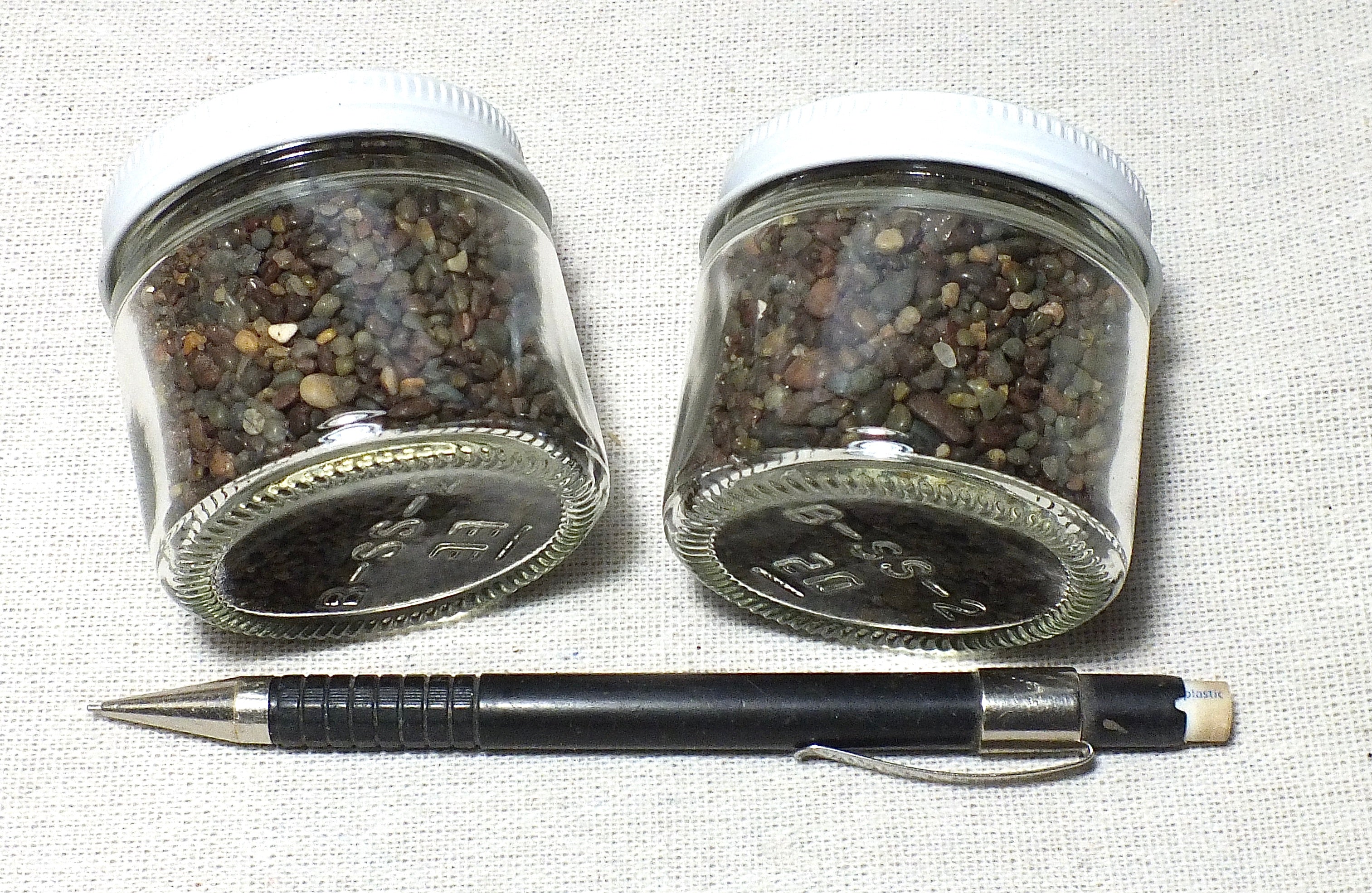 sand - coarse sand composed of polished chert grains derived from the Franciscan complex - set of two 2-ounce jars