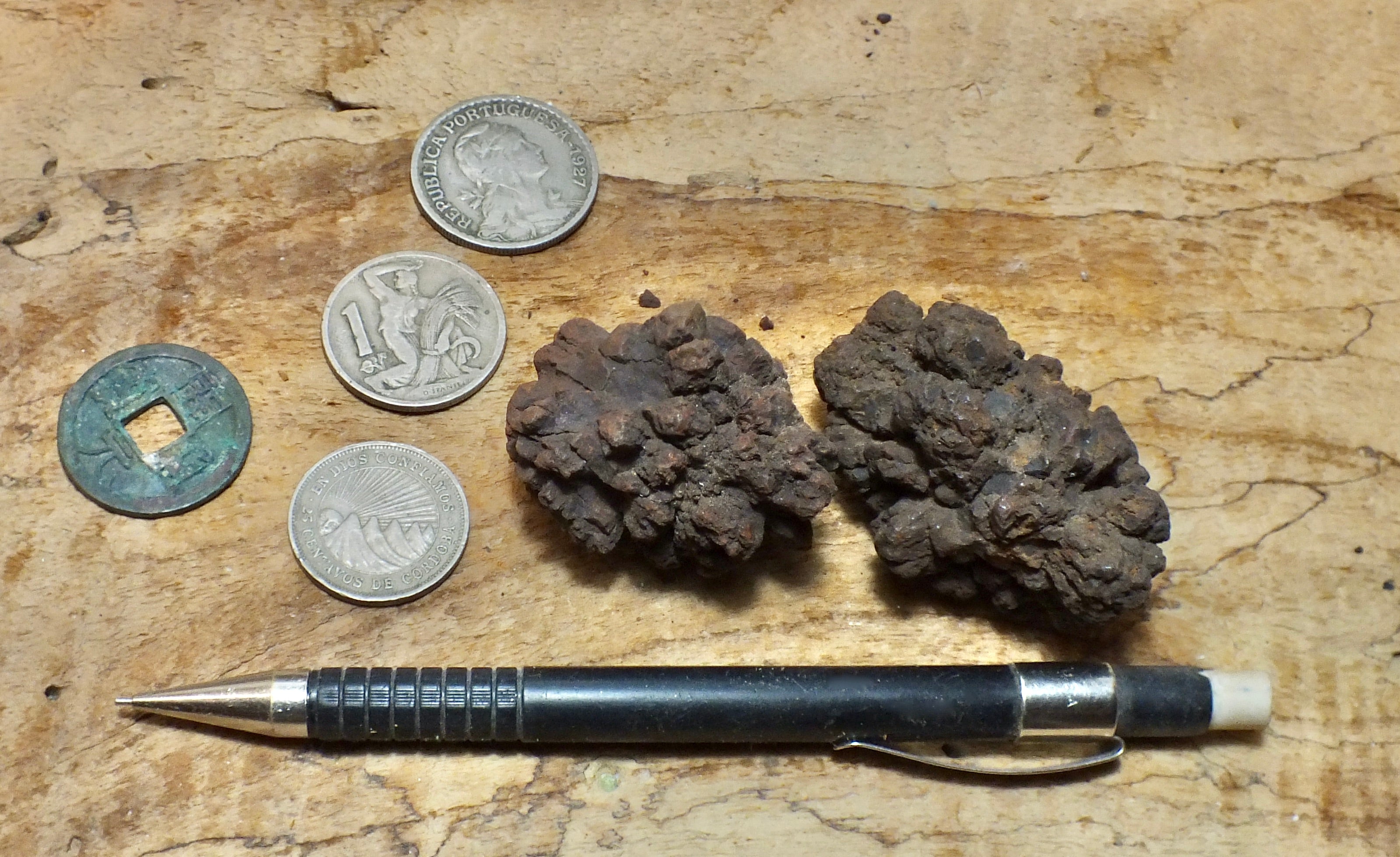 Similar lumpy ironstone concretions weather out of sandstone in the Cretaceous Dakota Formation in Ellsworth County, Kansas. The concretions shown here were and are widely sold as fossilized turtle dung from Madagascar.