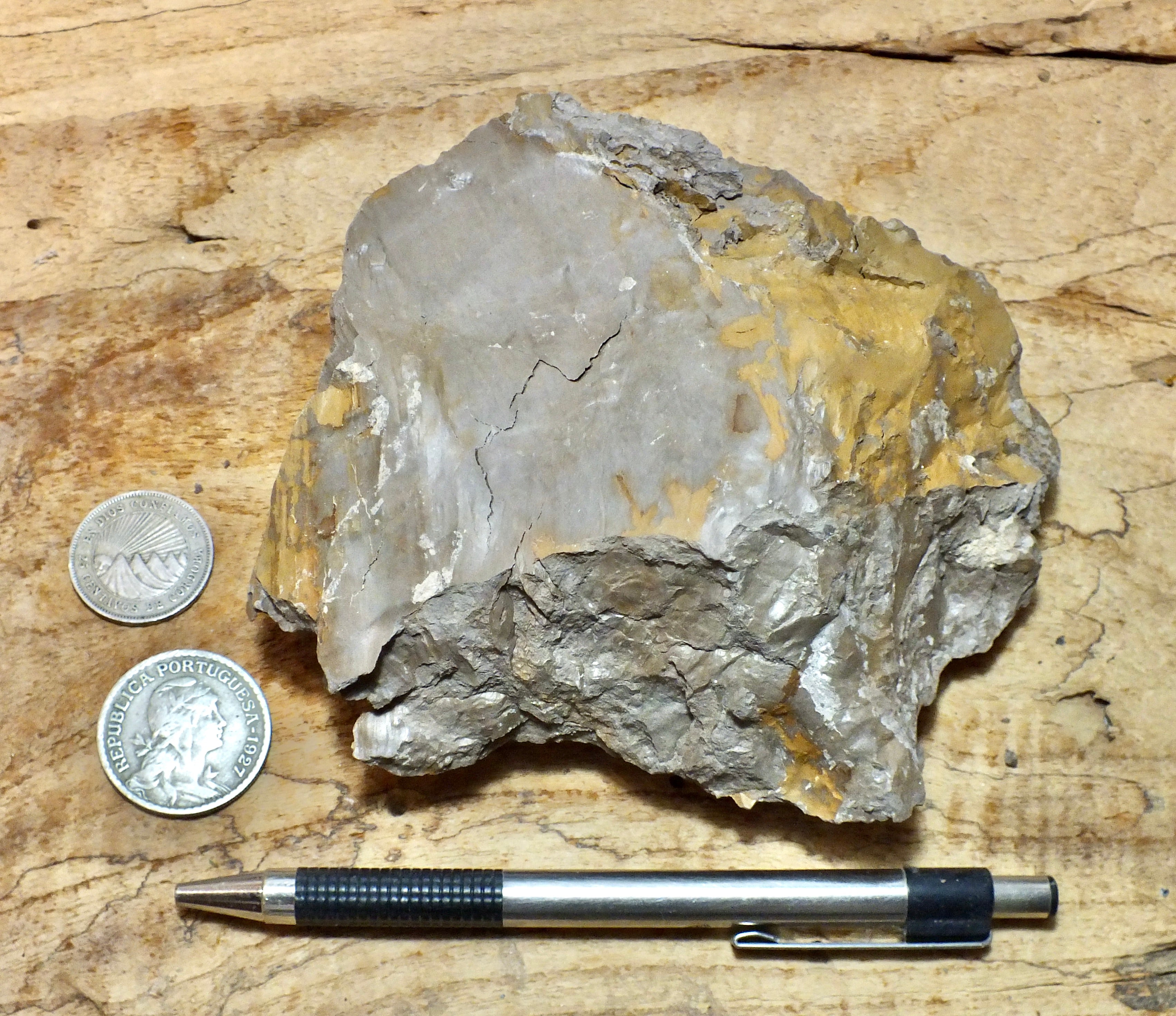 Select a specimen: You can select a specimen by telling us what is in the photo with it, a black and silver pen, a black mechanical pencil or one of those plus some number of coins, or you can let us make the selection.