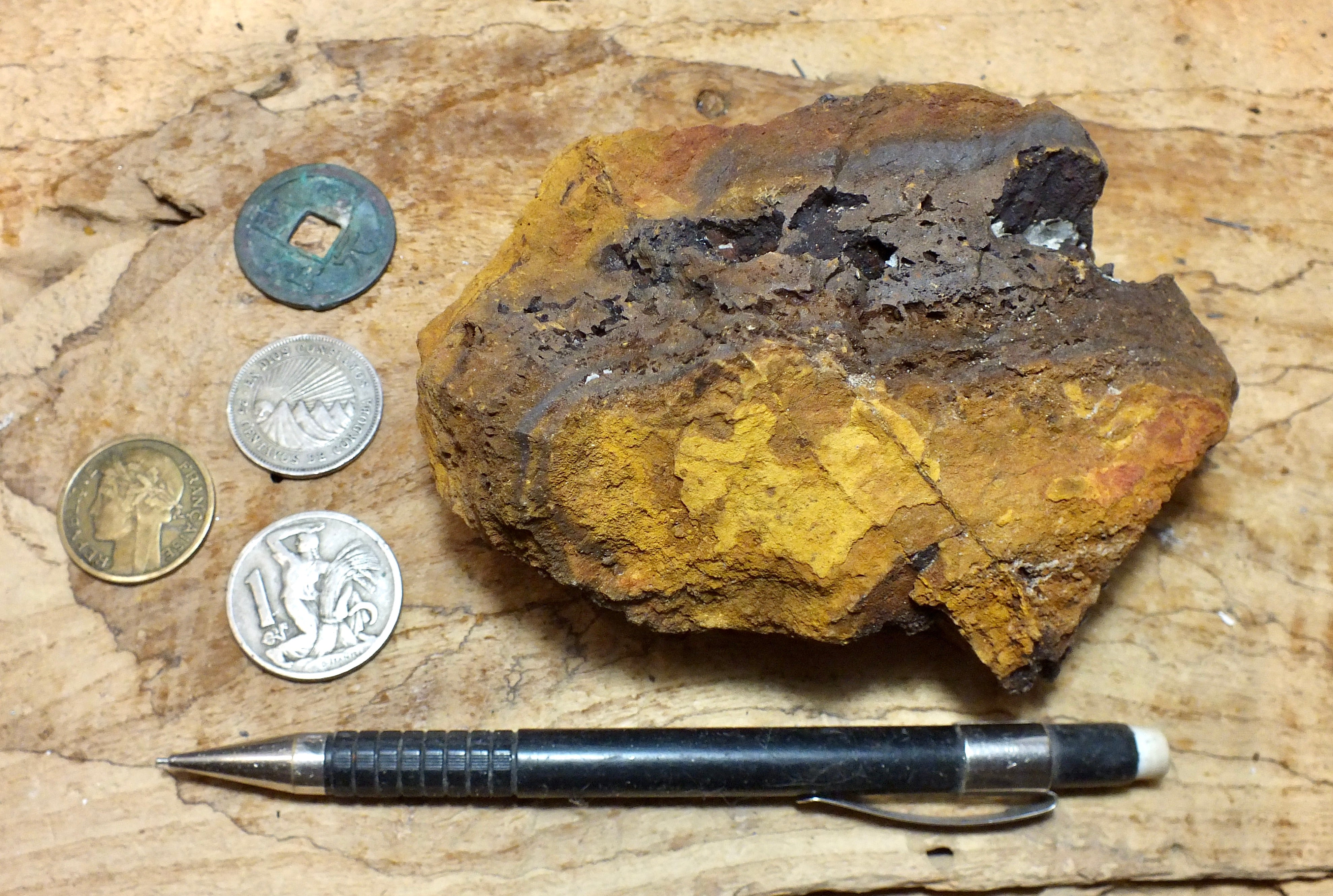 The pencil is 5 1/2"long, for scale. Both sides are shown of the specimen with a pencil and one coin.
