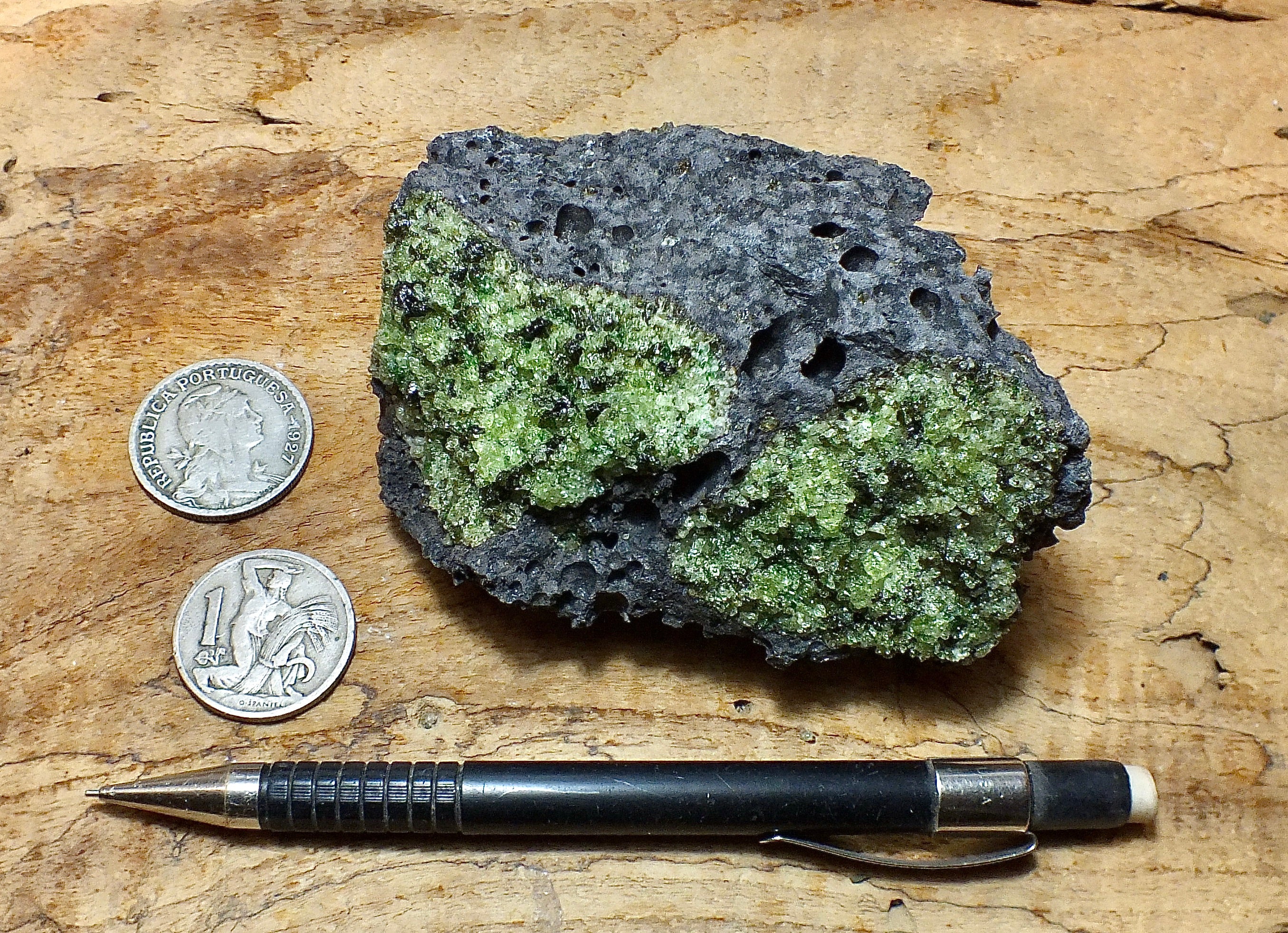 A xenolith is a piece of country rock introduced into a magma during an eruption or emplacement of a batholith. These xenoliths represent fragments torn at depth from a peridotite rock mass through which the phonotephrite magma was forced. Their granular texture resulted from multiple crystallization nuclei. The vesicular phonotephrite that contains these xenoliths erupted in the Middle Pleistocene ~580,000 years ago and caps Peridot Mesa on the San Carlos Apache Reservation east of Globe, Arizona.