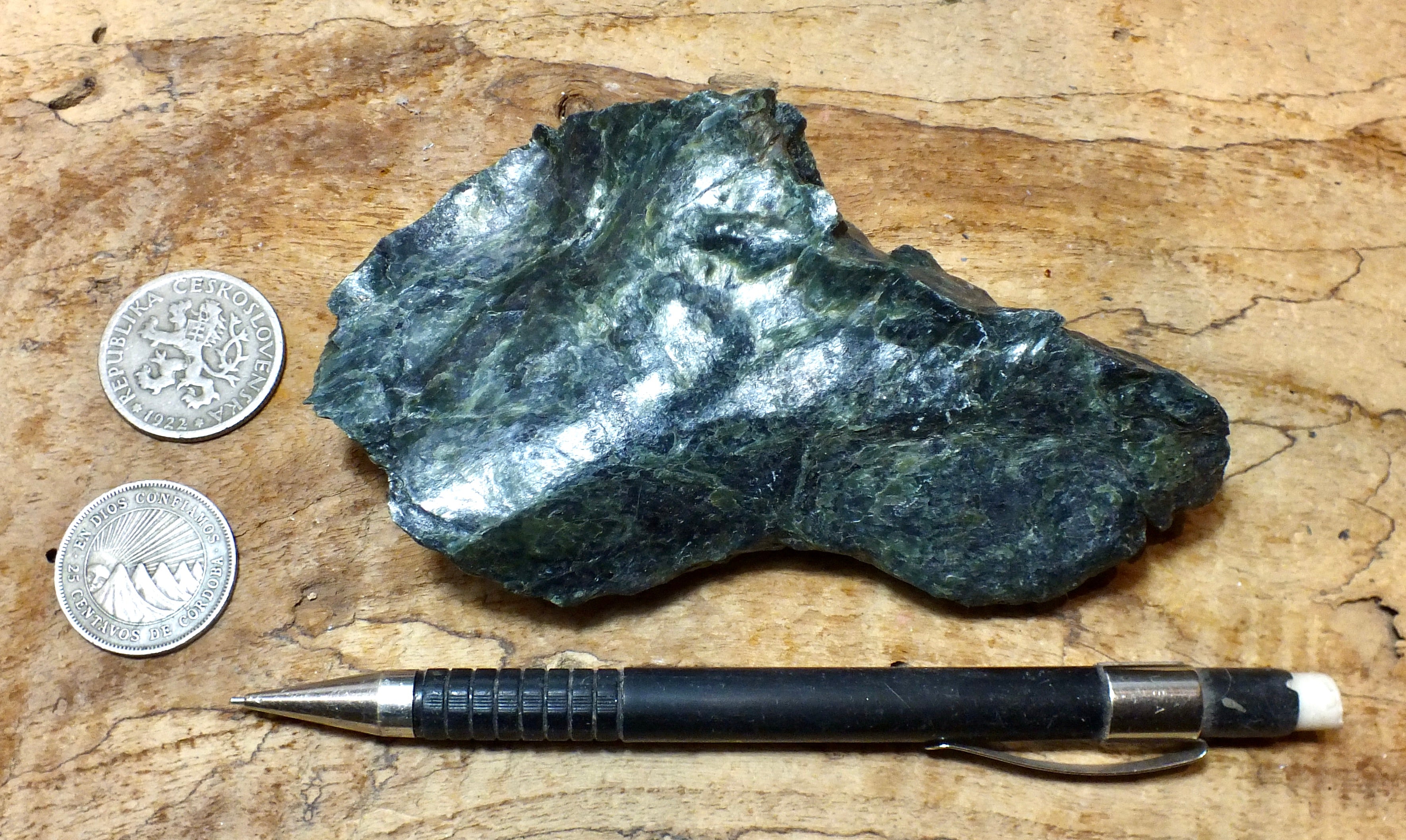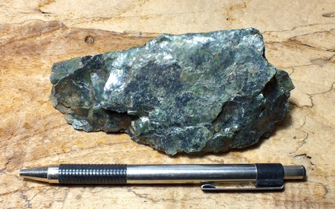 These textbook specimens were collected from the Melones fault zone in the American River Canyon, Placer County, California, right in the Forty-Niner gold belt. They are glossy dark green and say "squeezed" to a student.