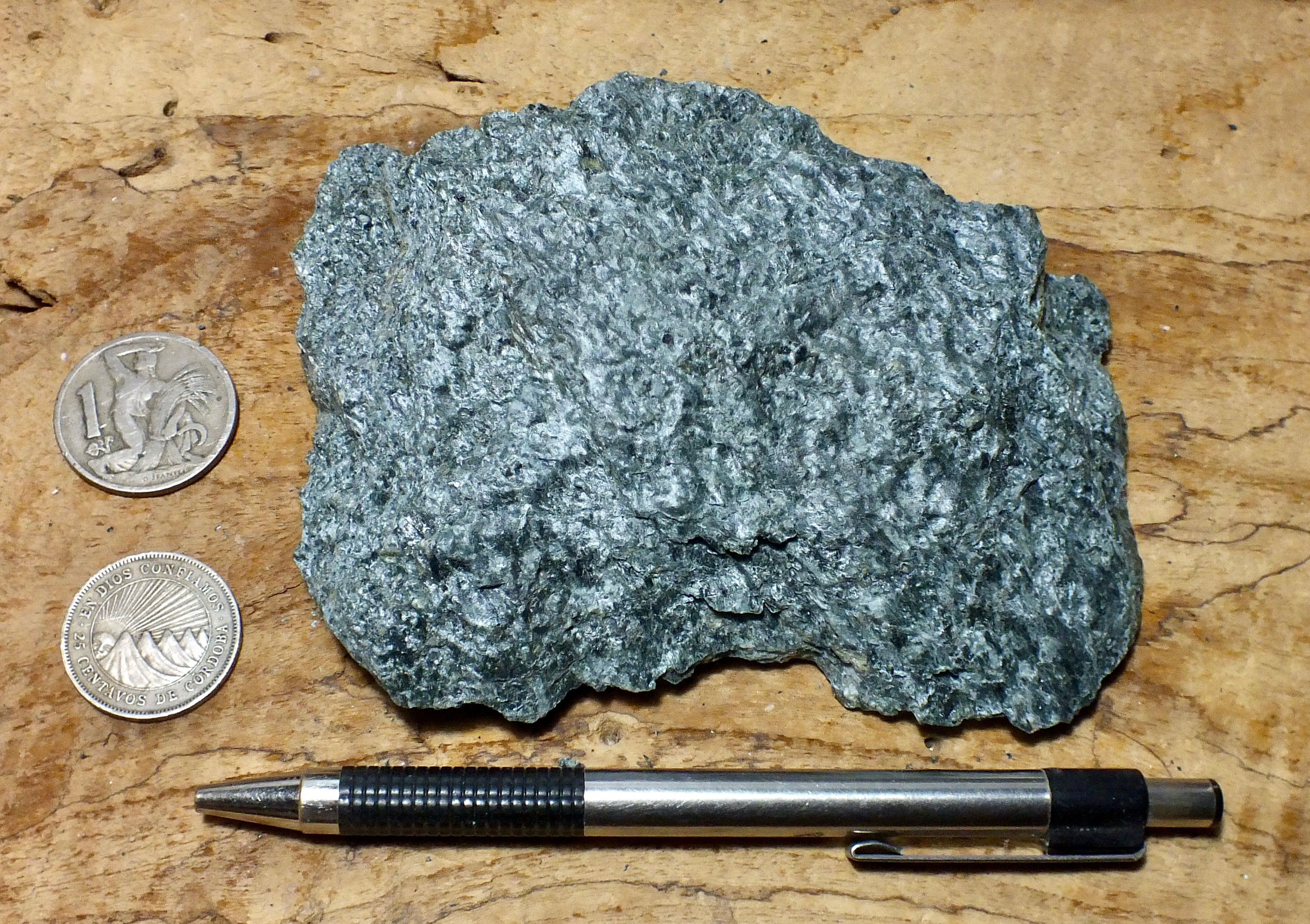 This attractive dark green schist is mapped as a greenstone schist, has an uneven foliated parting, is composed of chlorite, epidote and albite feldspar. Schists vary greatly in composition and appearance. They are often derived from clays and muds and shales and fit into a metamorphic sequence of slate, phyllite, schist and gneiss in order of increasing metamorphosis. They can also be derived from fine grained igneous rocks. This schist, a unit of the Pelona Schist, was metamorphosed from silica poor igneous rocks. The specimens were collected in San Antonio Canyon, San Gabriel Mountains, Los Angeles County, California.